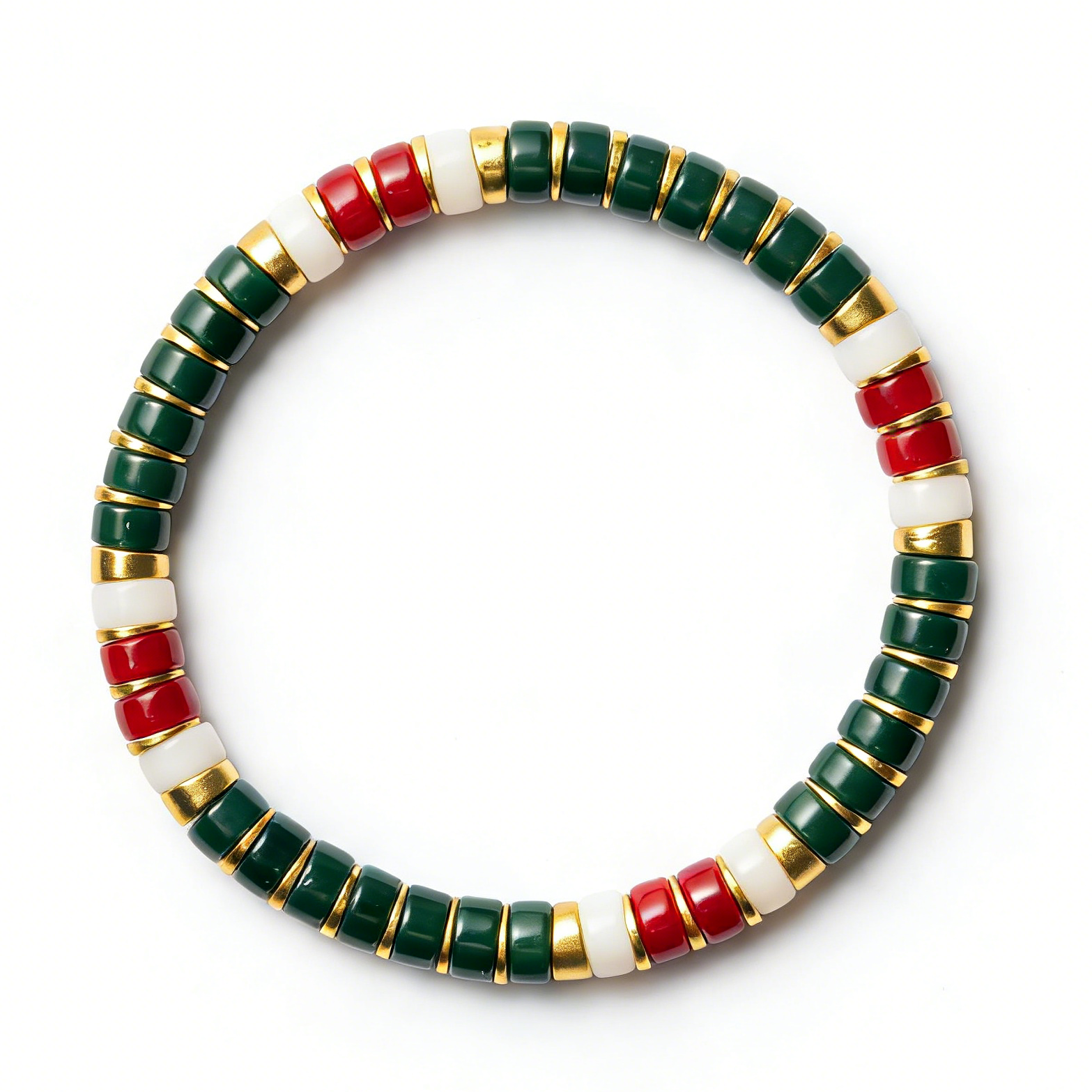 Inspired by Algeria’s flag palette, this bracelet is crafted from smooth colored glaze beads in deep green, crisp white, and bold red, separated by sleek gold-tone spacers. Lightweight and comfortable on an elastic stretch cord, it’s made for everyday wear—clean, modern, and easy to stack or wear solo as a subtle statement of pride.