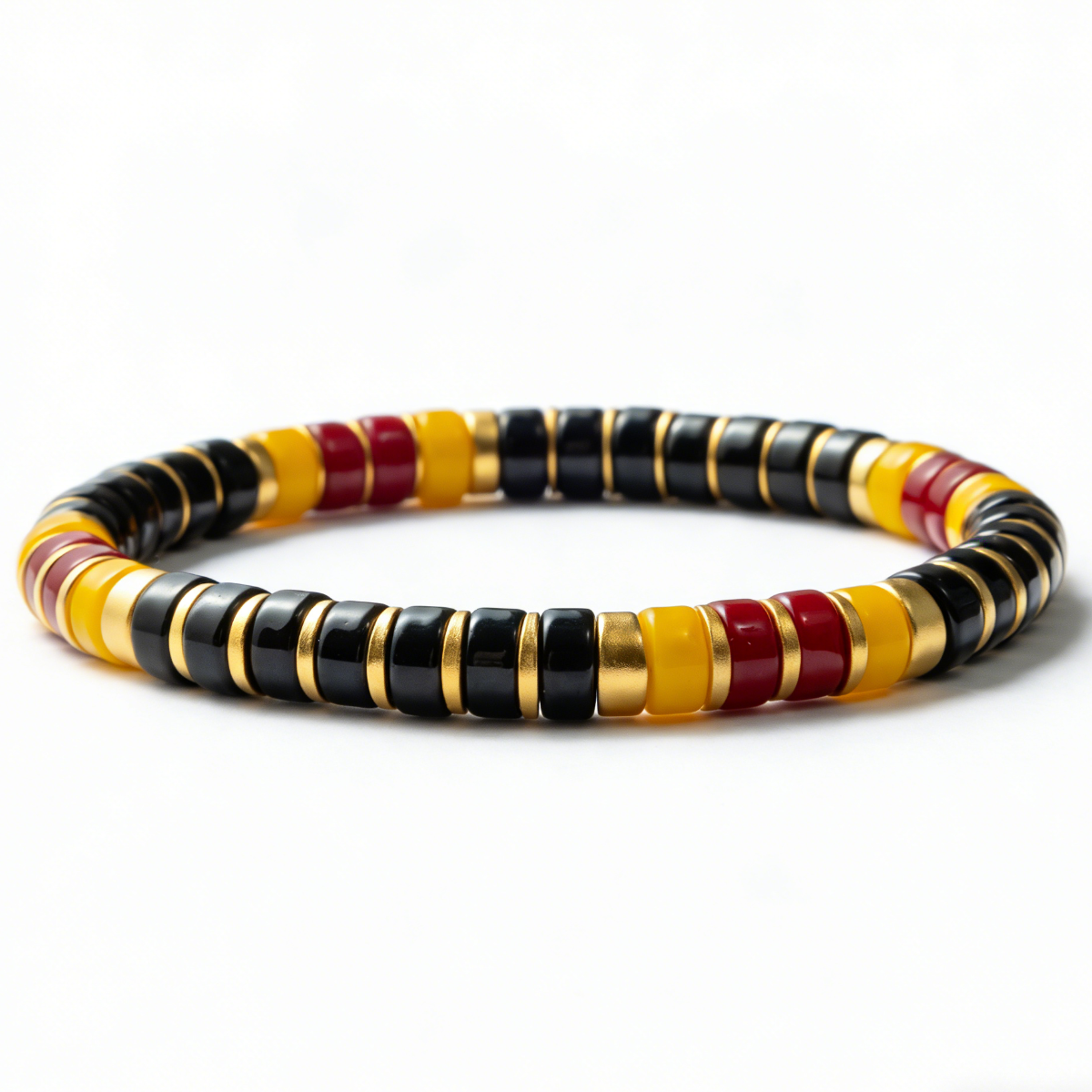 Rooted in Belgium's striking chromatic identity, this bracelet features smooth Colored Glaze beads in black, yellow, and red, anchored by warm gold-tone spacers that create visual sophistication. The elastic stretch construction offers a secure, adaptable fit suitable for any wrist size. Equally at home as a standalone piece or layered within a collection, it balances bold color blocking with refined restraint—a versatile accessory that transitions seamlessly from spirited occasions to understated everyday elegance.