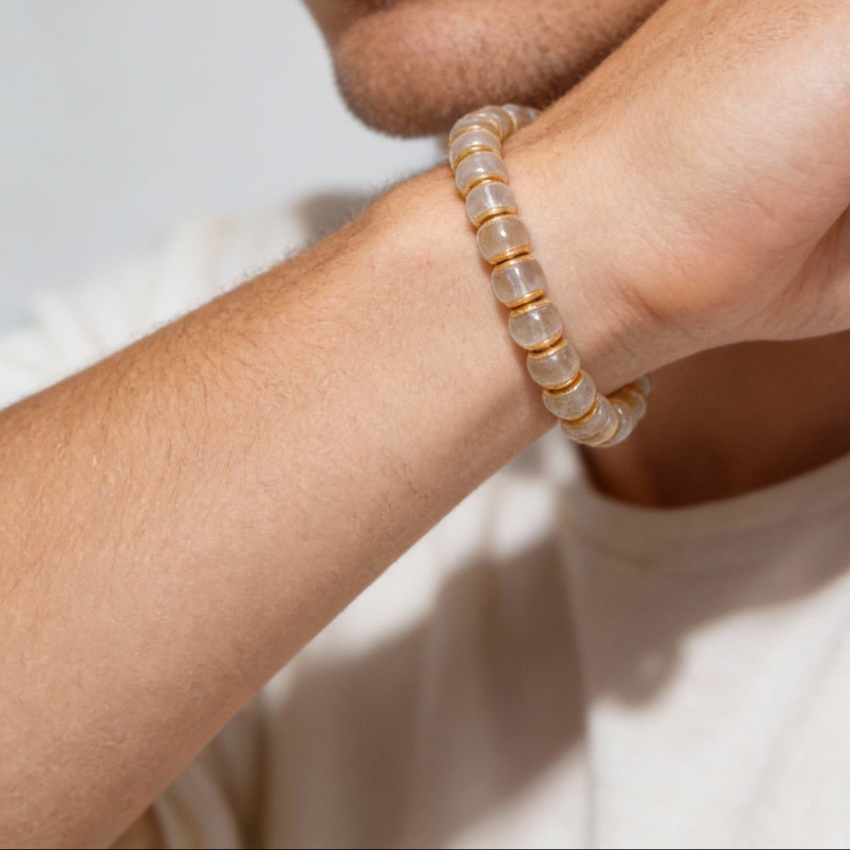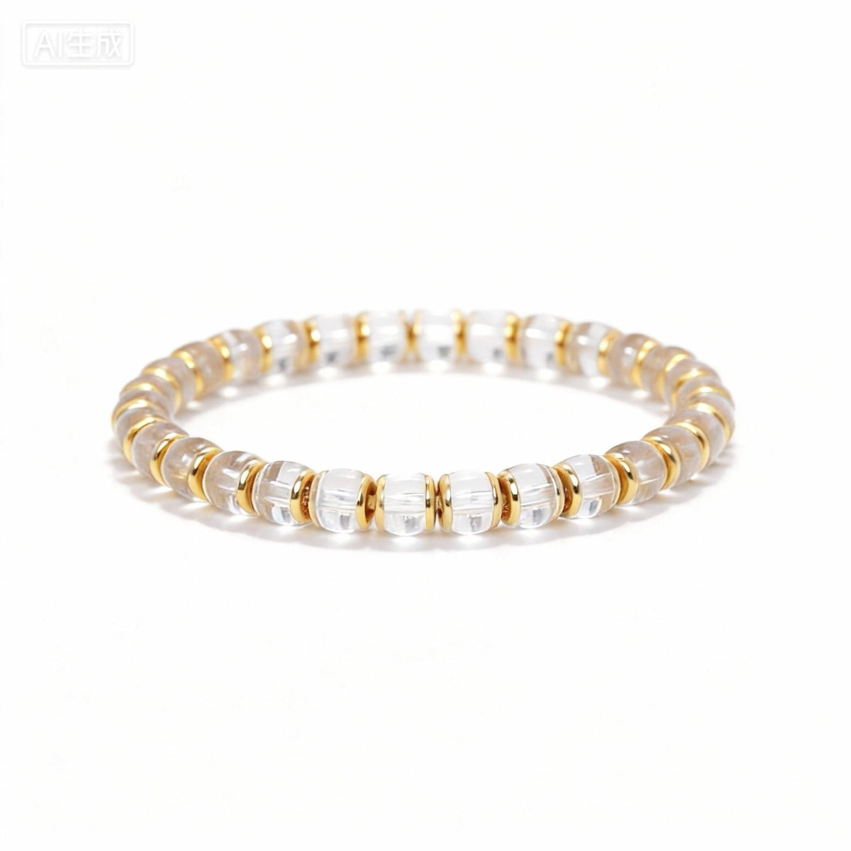 Clean and luminous, this bracelet is made with clear crystal disc beads that reflect light with a crisp, glassy shine. Warm gold-tone spacers create an even rhythm around the strand, adding contrast and a polished, modern finish. The transparent crystal look keeps it minimal yet elevated, making it easy to wear every day—beautiful on its own and effortless to stack with other bracelets. Each bead has slight natural variation that adds subtle depth without changing the clean aesthetic.