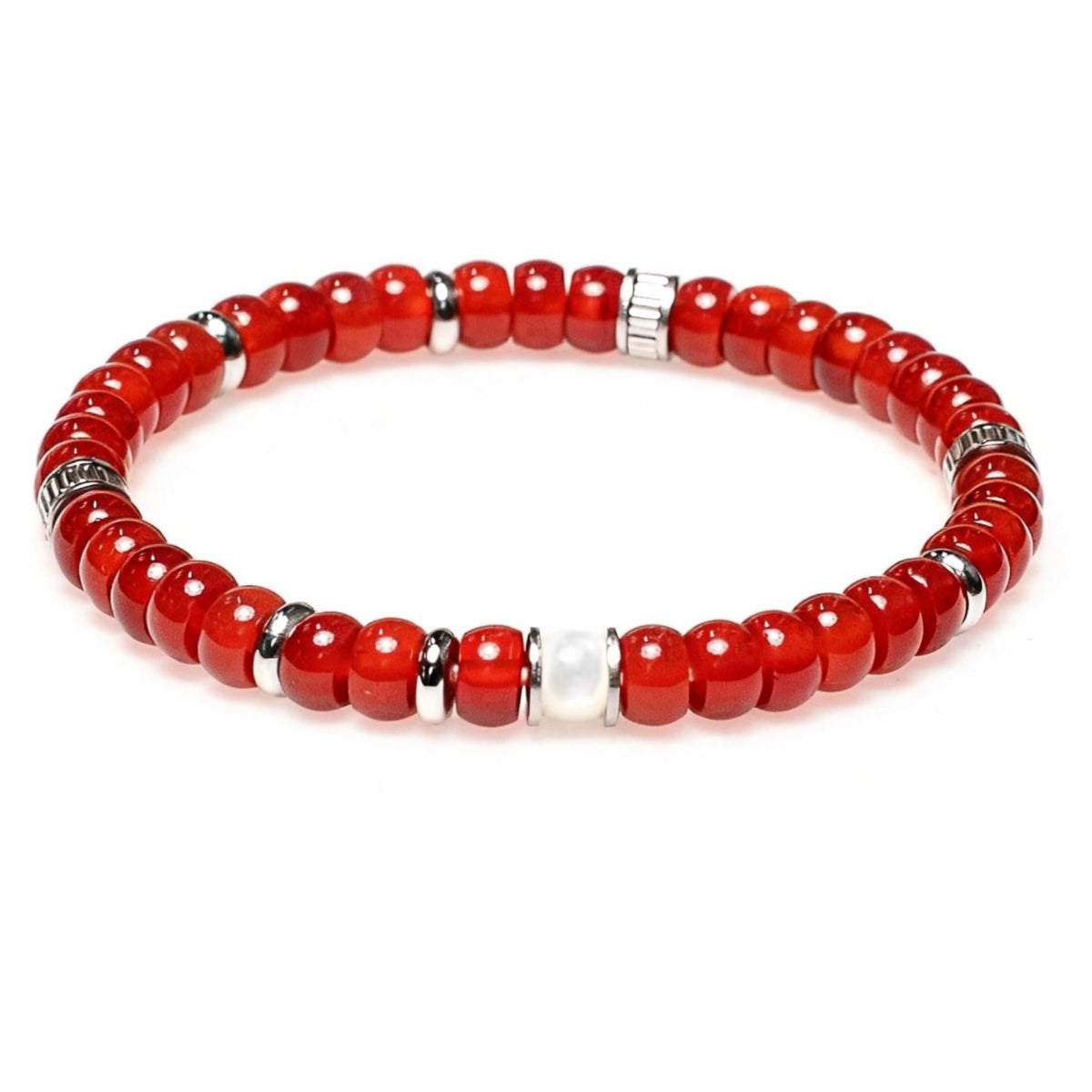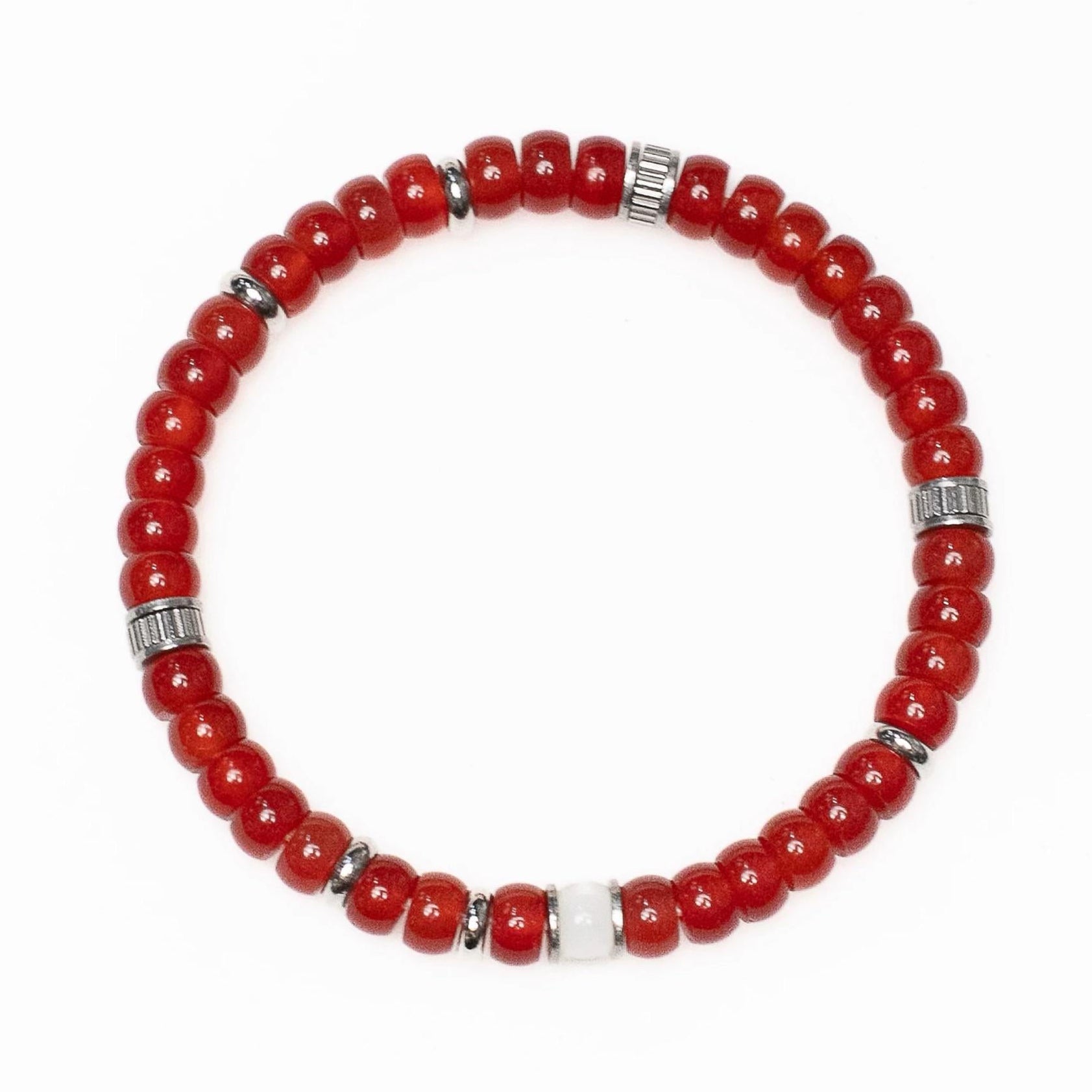 A clean, energetic strand of glossy red agate beads, punctuated with cool silver-plated spacers and a single white accent bead—designed to feel sharp, modern, and easy to stack.