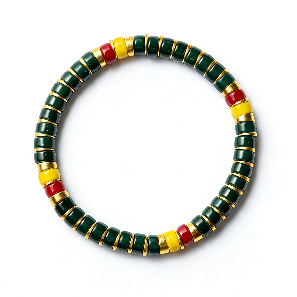 Featuring hand-selected Colored Glaze beads in Senegal's iconic deep green, vibrant yellow, and striking red hues, this bracelet balances cultural authenticity with contemporary design. Gold-tone spacers provide refined definition between each bead, while the elastic cord construction ensures comfortable, all-day wearability without compromise. A versatile piece that transitions seamlessly from casual styling to statement-making occasions, grounded in meaningful color symbolism.