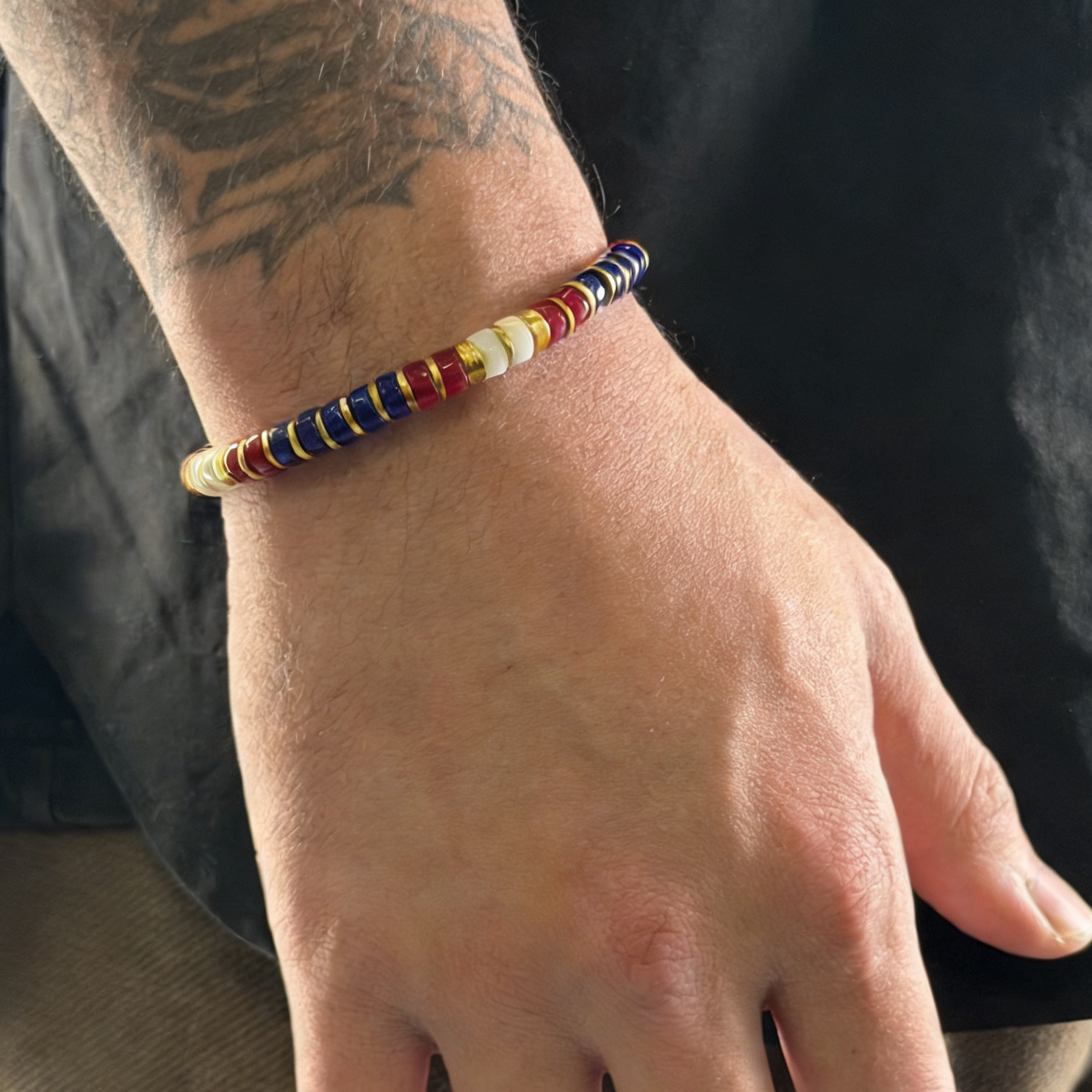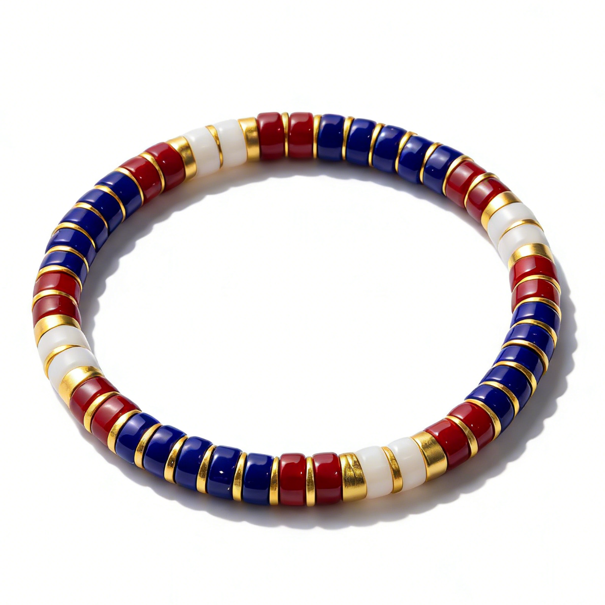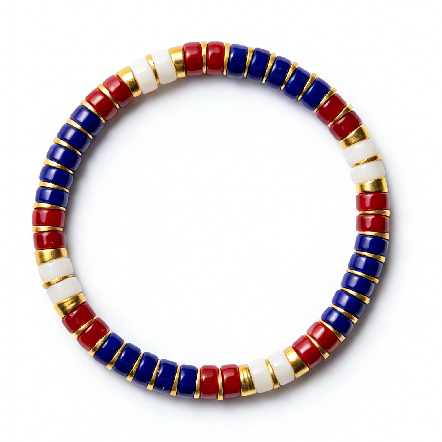 Featuring hand-selected Colored Glaze beads in patriotic red, white, and blue tones, this bracelet combines timeless American symbolism with refined craftsmanship. Warm gold-tone spacers provide sophisticated visual separation between each bead, while the elastic cord construction ensures a secure, comfortable fit for all-day wear. Perfect for those seeking understated patriotic expression or a versatile accent piece that bridges casual and polished styling.